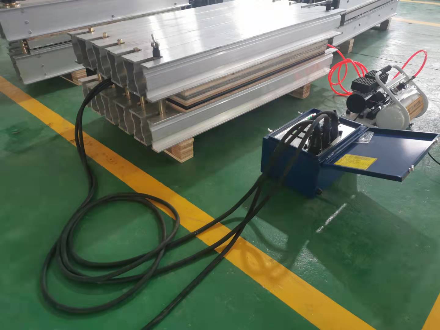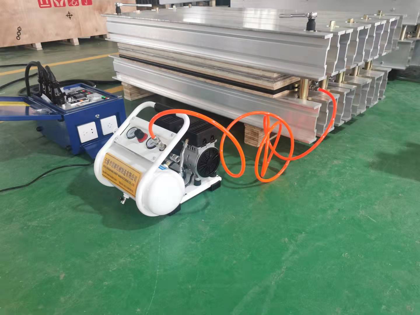 硫化机的主要机件,为铝合金制造。特点是:体积小、重量轻,搬运方便;电热元件为片式结构,采用三相电路联结,电压为380V(或660V),工作平稳,可靠,电流小;热板壳体为铝合金制造,热惰性和方向性小,所以热板工作平面温度均匀;电热板工作中,从升温到硫化,均由电热控制箱自动控制温度和时间,耗能小,热效率高,操作方便,工作可靠,硫化质量好;压力装置为板式水压,结构简单,维护方便,硫化压力大,且均匀等优点。是国内、外较为先进的胶带硫化胶接设备之一。